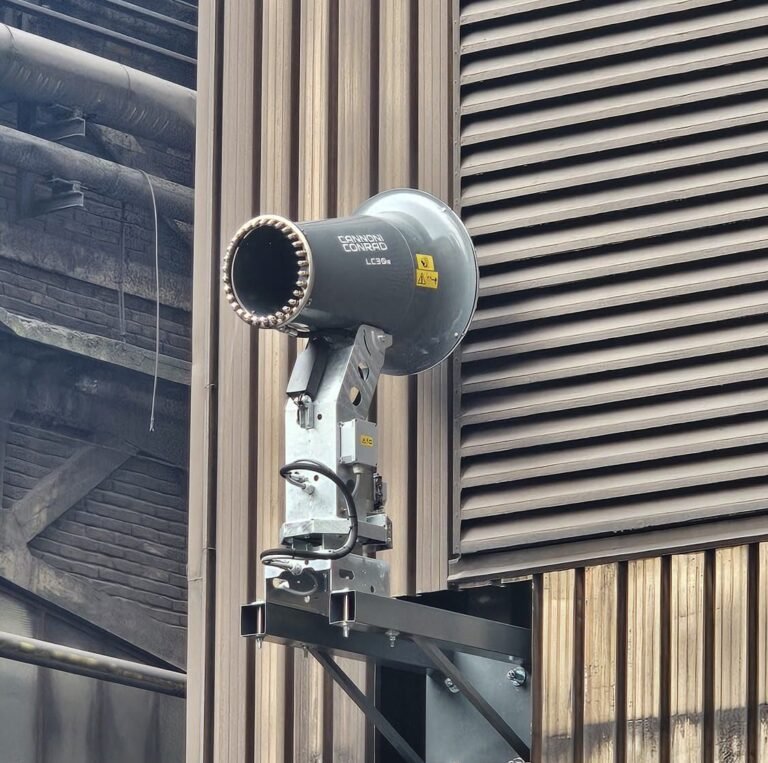 Abbiamo quindi optato per una configurazione “bikini”, con il cannone installato in quota tramite una mensola fissata a una struttura esistente, mentre la centralina con pompa e comandi è stata posizionata a terra. Questa soluzione ha permesso di liberare completamente l’area di passaggio dei mezzi, mantenendo al contempo un accesso semplice e sicuro per la gestione e la manutenzione dell’impianto.
